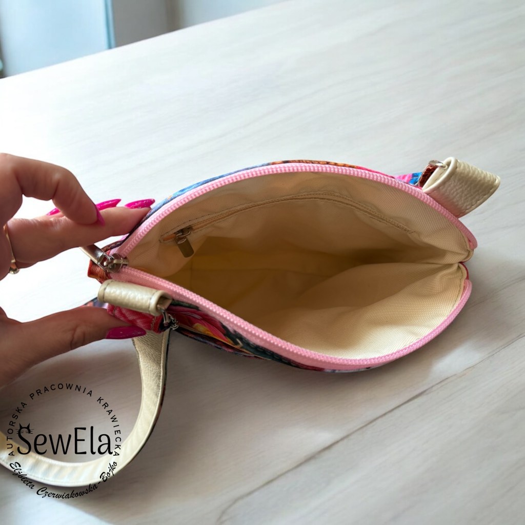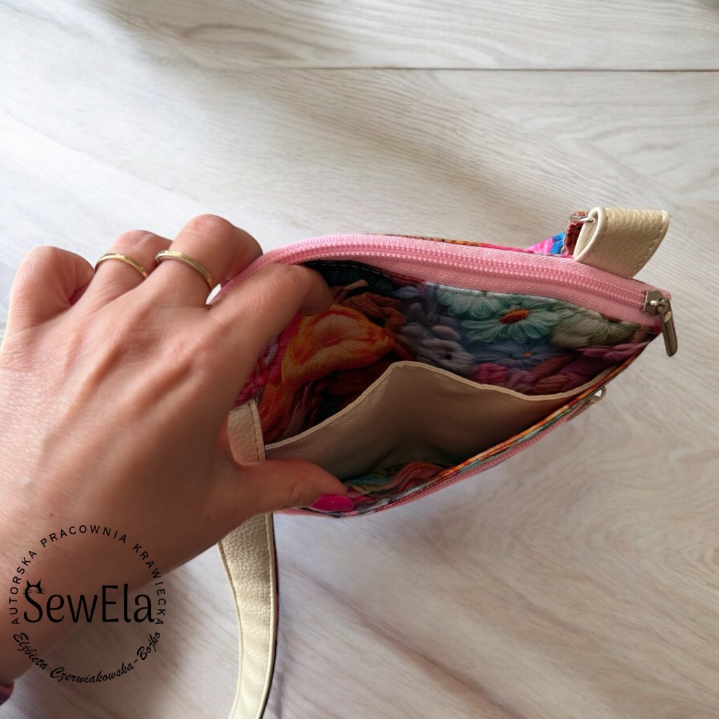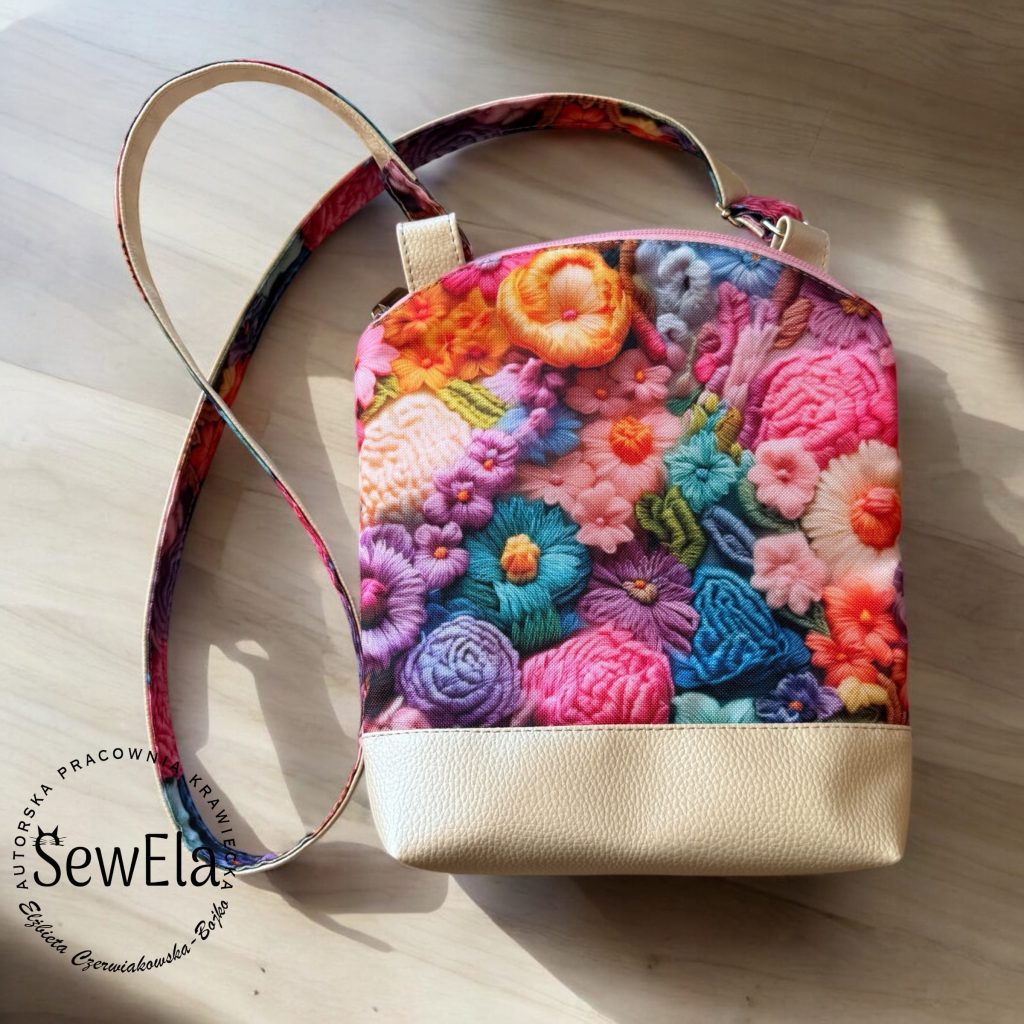 Ta niewielka torebka potrafi bardzo dużo! Postanowiłam ją wykonać w kolorach wiosny – beżowa ekoskórka z kwiatowymi jasnymi dodatkami tkaniny wodoodpornej.